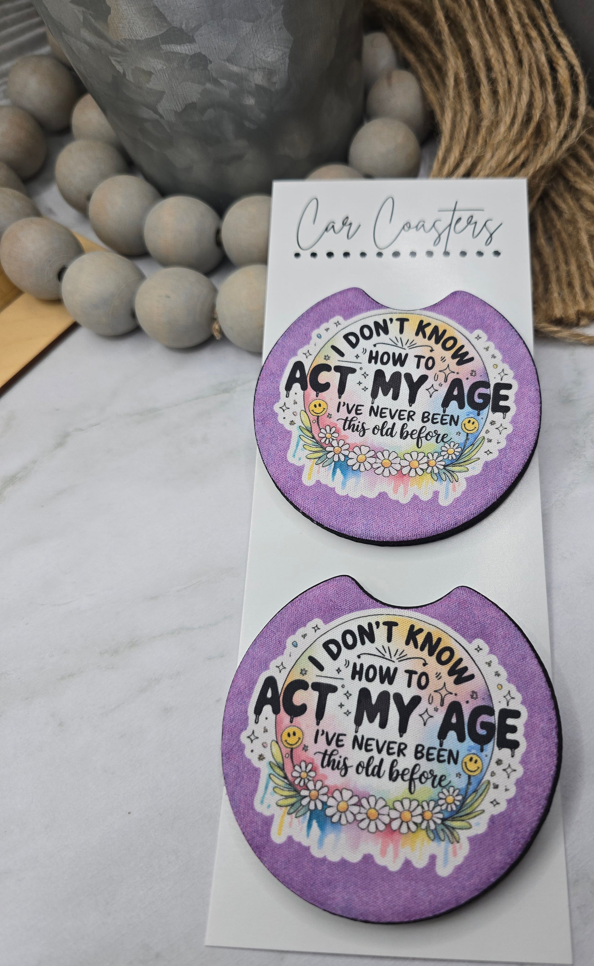 Upgrade your car's style with Act My Age Car Coasters! These sarcastic neoprene coasters are both functional and humorous, making them the perfect addition to any car. Keep your cup holders clean and show off your playful personality with these coasters. Drive with sass and style! Recommended for ages 14+.