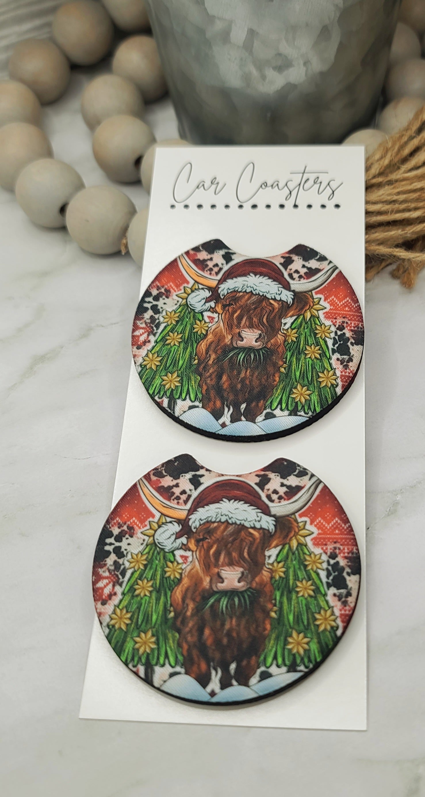 Bring a little festive fun to your car with our Christmas Highland Cow Car Coasters! With holiday-themed neoprene, these car coasters will make your car extra cozy and stylish this season. Add a whimsical touch of Christmas to your ride! Recommended for ages 14+. Set of 2. Approximately 2.75 inches round.