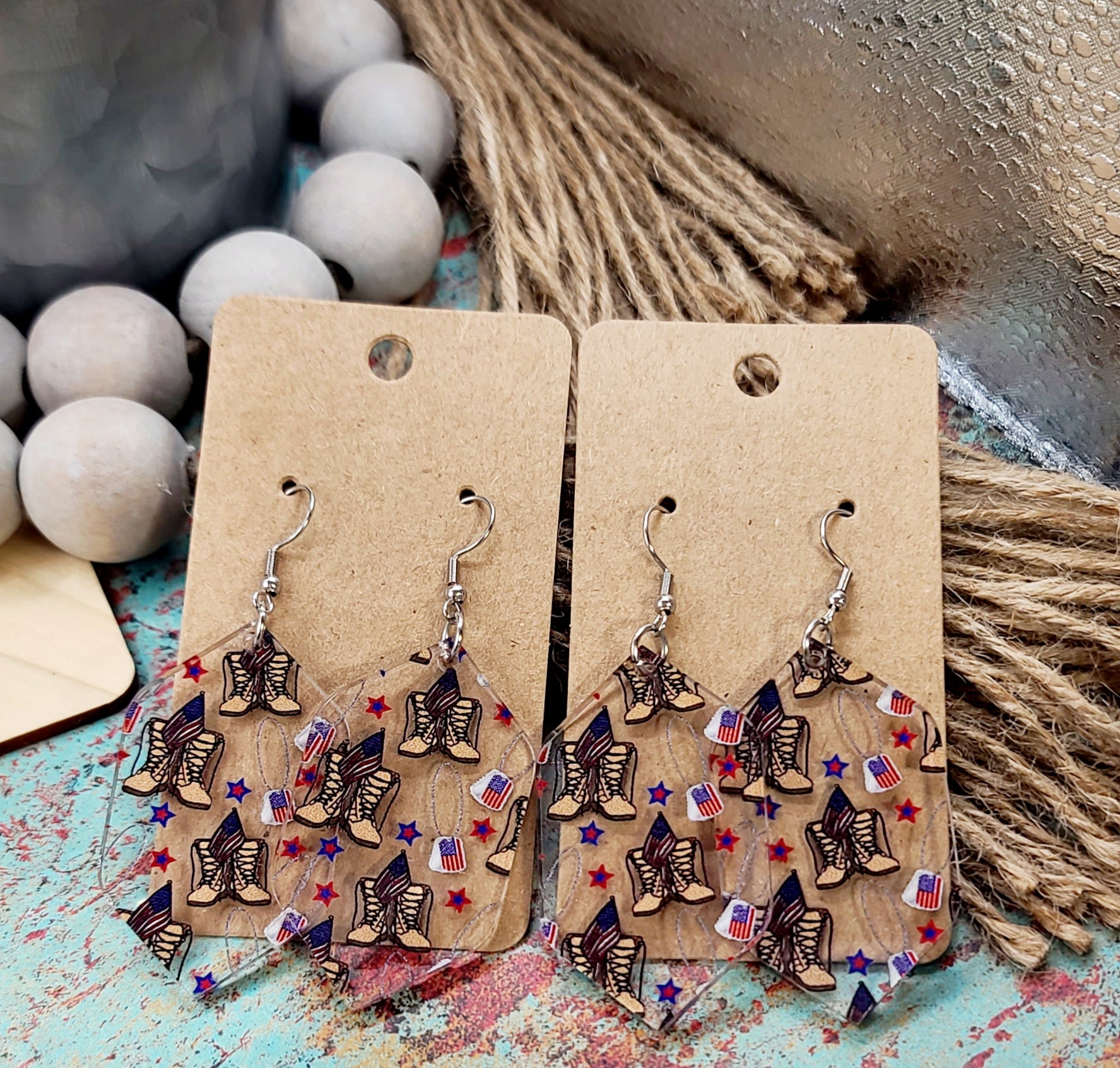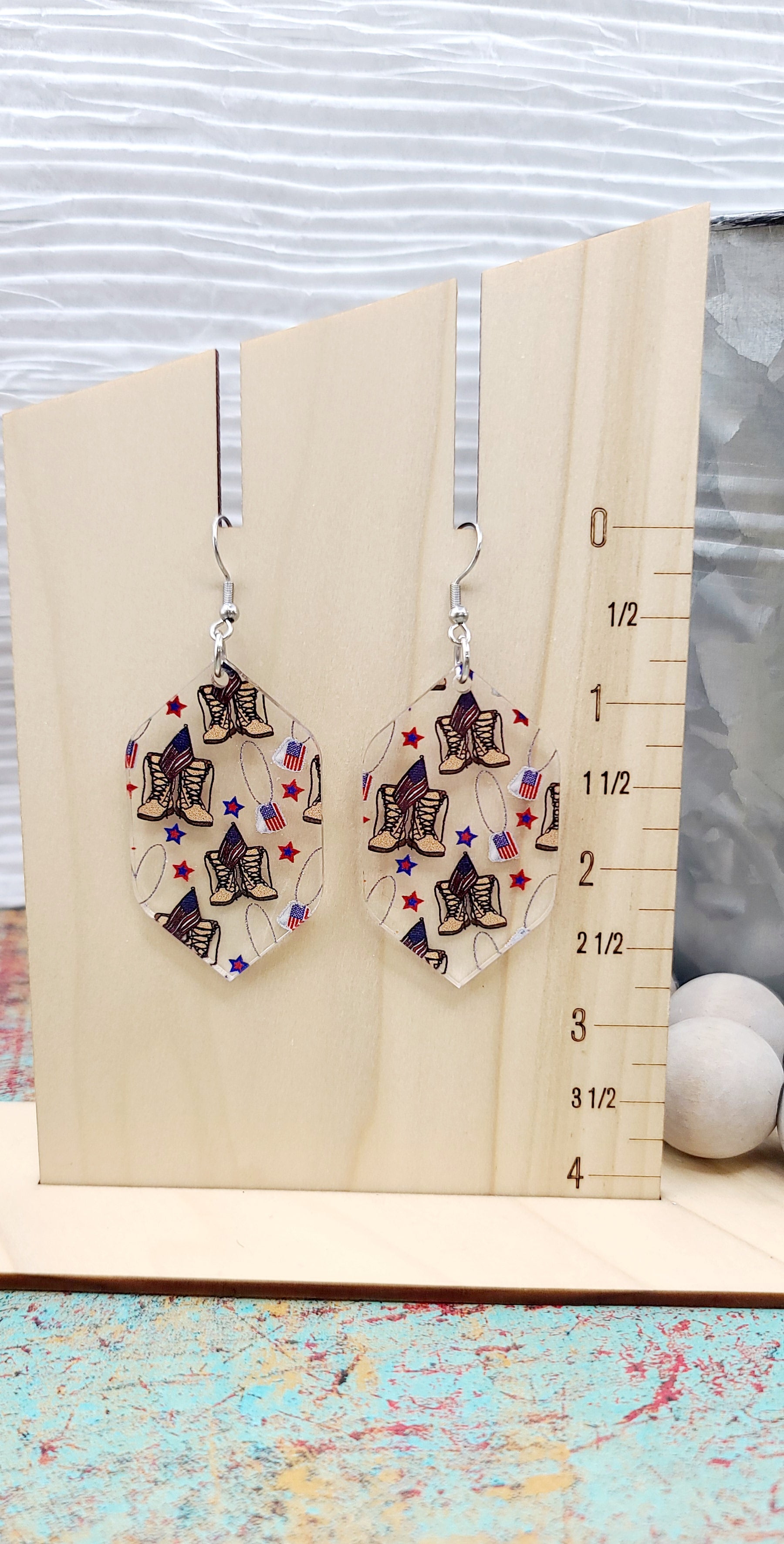 Adorn yourself with these unique Combat Boots & Dog Tags Earrings, a symbol of patriotism and strength. Show your support for the troops and make a bold fashion statement with these beautiful and stylish earrings. Crafted from high-quality acrylic, these earrings are sure to make you stand out. Show your pride and strength with Combat Boots & Dog Tags Earrings. Recommended for ages 14+.