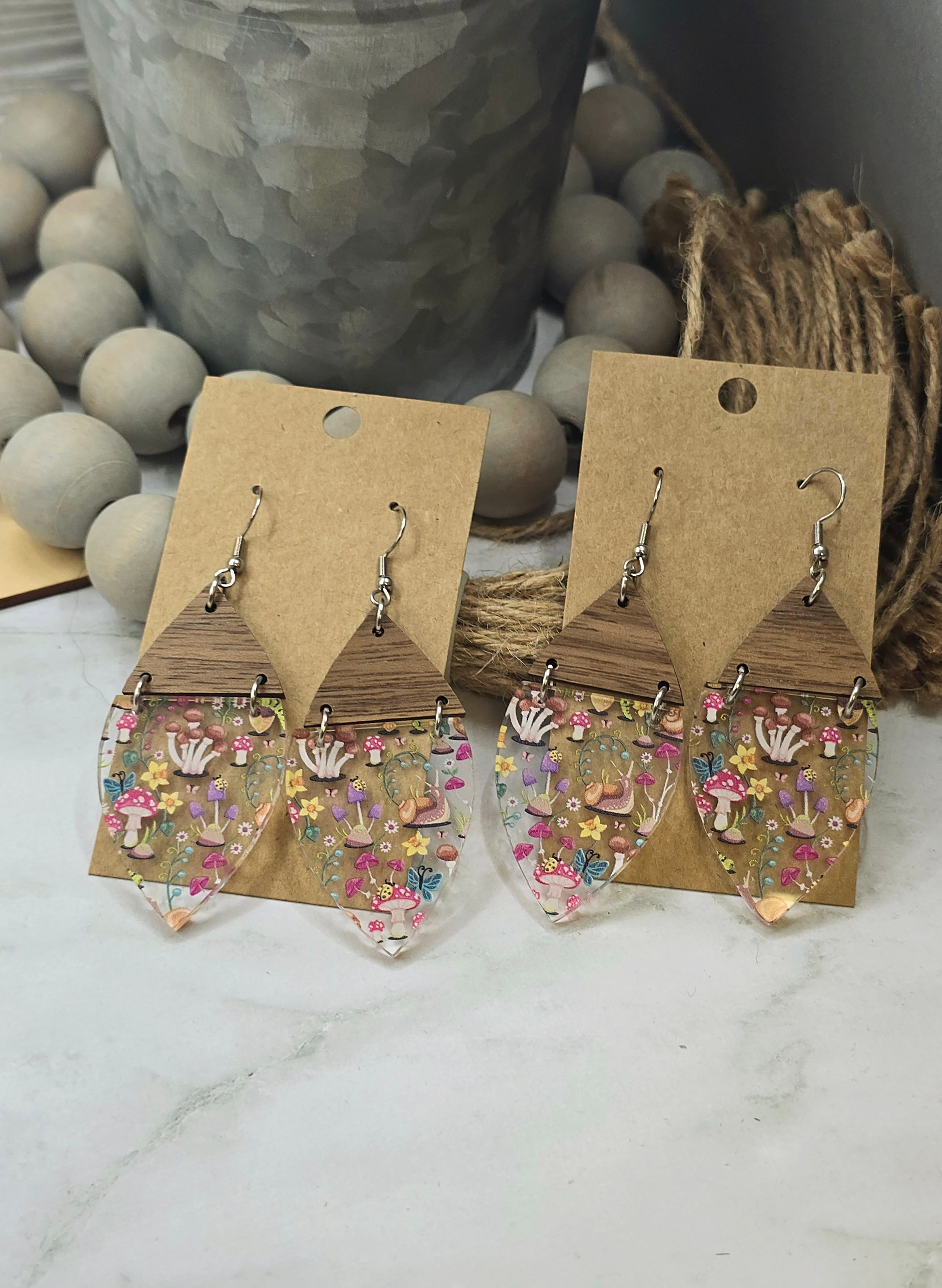 Elevate your style with our Mushroom Garden Split Petal Earrings! These beautifully crafted earrings feature a unique design made with walnut wood and pattern acrylic, giving them an elegant yet playful touch. Stand out from the crowd and add a touch of sophistication to any outfit. Recommended for ages 14+.