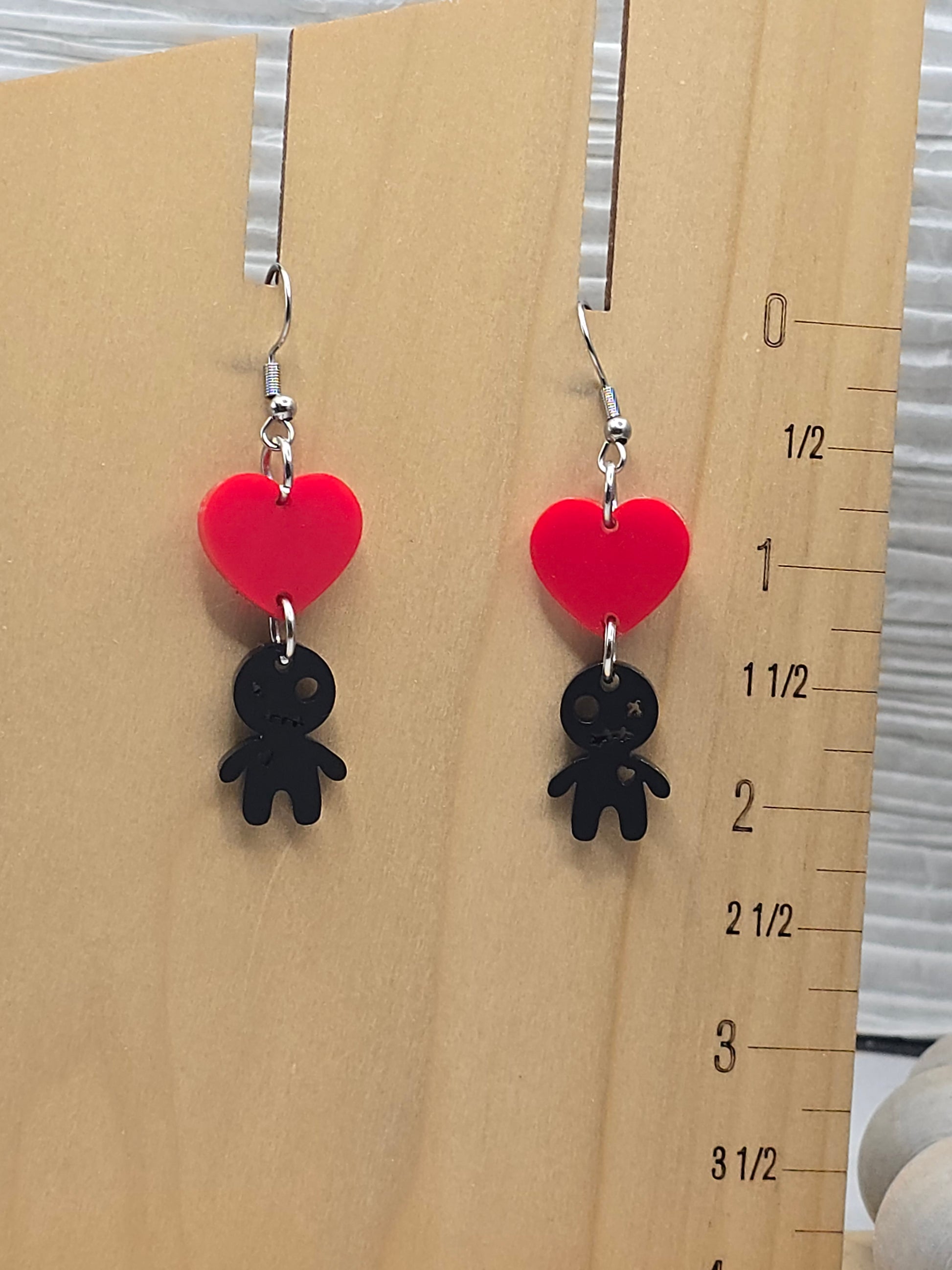 Unlock your inner voodoo goddess with our Voodoo Heart Earrings! Made from acrylic, these uniquely designed earrings feature both a heart and voodoo doll, adding a touch of mystique and charm to any outfit. Embrace your wild side and make a statement with these one-of-a-kind earrings. Recommended for ages 14+.